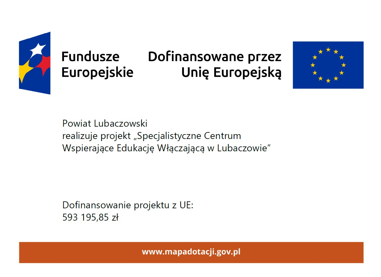 Projekt „ Specjalistyczne Centrum Wspierające Edukację Włączającą w Lubaczowie” realizowany jest w okresie od 01.09.2025 r. do 30.11.2026 r. w ramach programu Fundusze Europejskie dla Rozwoju Społecznego przez Powiat Lubaczowski, we współpracy z Zespołem Placówek im. Jana Pawła II w Lubaczowie.