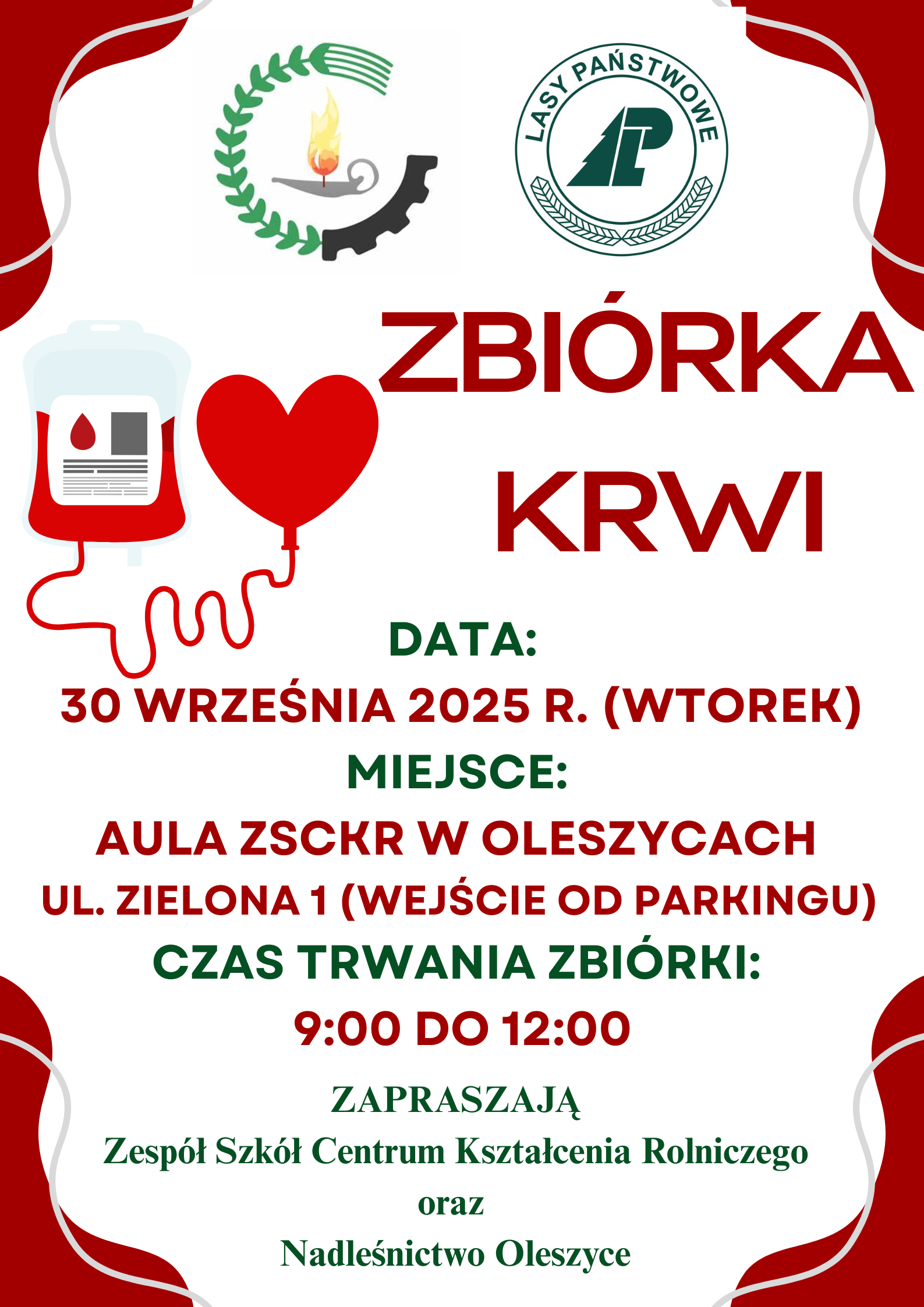 W dniu 30 września 2025r. (wtorek) odbędzie się ZBIÓRKA KRWI organizowana przez Zespół Szkół Centrum Kształcenia Rolniczego w Oleszycach we współpracy z Nadleśnictwem Oleszyce. Akcja przeprowadzona będzie w auli szkoły w godzinach od 9:00 do 12:00 przez zespół z RCKiK z Rzeszowa.